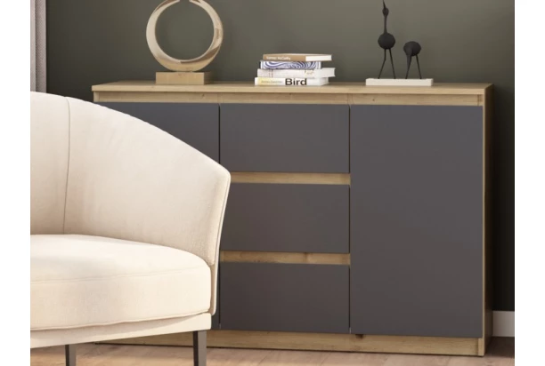 Komoda so šírkou 120 cm s 3 zásuvkami v dekore dub artisan/grafit ponúka praktické úložné priestory, účelnosť a čisté línie tvarov, ktoré sa hodia do každého interiéru.