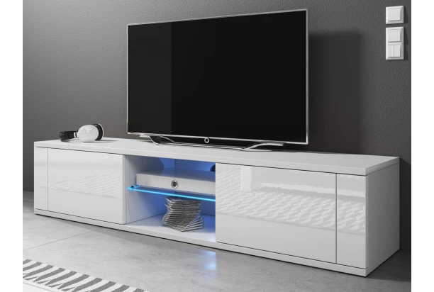 TV skrinka so šírkou 140 cm v prevedení biela lesk má minimalistický dizajn, vďaka ktorému skvele zapadne do každého moderného bytu. Po stranách sú dvierka s vnútorným úložným priestorom a uprostred odkladacej priehradky so sklenenou policou, ktorú si môžete prípadne doplniť LED osvetlením.