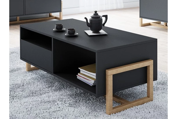 Konferenčný stolík so zásuvkou z kolekcie Oslo – minimalistický dizajn čierneho nábytku dopĺňa zaujímavo tvarovaná podnož z masívneho bukového dreva. Nábytok je tak funkčný, pôsobí originálne a skvele doplní moderný interiér bytu.