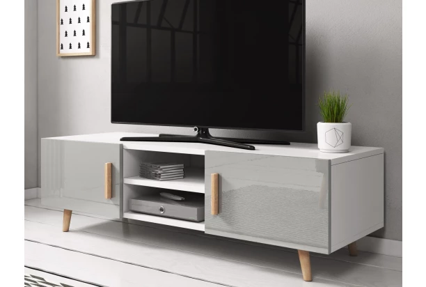 TV skrinka z radu Sweden – nábytok v obľúbenom škandinávskom štýle je moderný a zároveň aj útulný. Vyrobený v kombinácii biely/sivý lesk, na útulnosti pridávajú úchyty a nôžky z masívneho bukového dreva. Po stranách nájdete úložné priestory a uprostred priehradky umiestnenie napríklad na elektroniku.