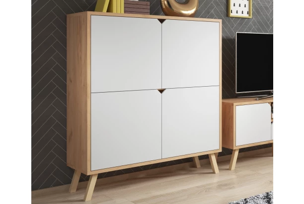Skrinka 4-dverová z nábytkového radu Tokio – nábytok v škandinávskom štýle má svoje čaro a je veľmi obľúbený. Masívne drevené nôžky a útulný drevodekor dub zlatý vytvára príjemný kontrast k bielym predným plochám. Nôžky z dreva dodávajú nábytku stabilitu a zároveň pôsobia zaujímavo.