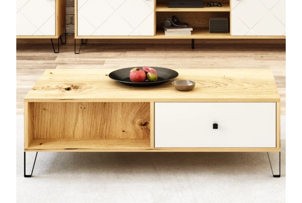 Konferenčný stolík so zásuvkami z nábytkového radu Bilbao – moderný nábytok na čiernej kovovej podnoži vyzerá v interiéri veľmi elegantne a vzdušne. Biele plochy zásuviek kontrastujú s útulným drevodekorom duba artisan.