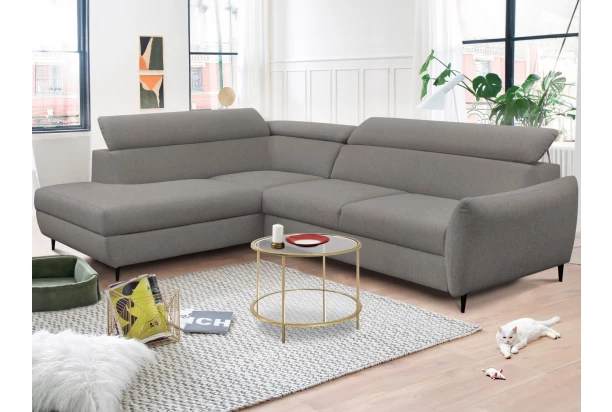 Rohová sedacia súprava v elegantnom dizajne prekvapí veľmi komfortným sedením. Pohodlne mäkké sedáky s polohovaním chrbtových opierok sa postarajú o Vašu každodennú pohodu. V prípade potreby môžete využiť praktický úložný priestor pod otomanom, ktorý vytvára ľavý roh. Rozkladaciu funkciu pre príležitostné spanie ocení nielen Vaša návšteva. Rohová sedačka je očalúnená príjemne mäkkou látkou v odtieni myšia šedá. Vďaka čiernym kovovým nôžkam pôsobí sedačka v interiéri moderne a zároveň vzdušne.