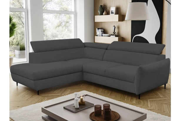 Rohová sedacia súprava v elegantnom dizajne prekvapí veľmi komfortným sedením. Pohodlne mäkké sedáky s polohovaním chrbtových opierok sa postarajú o Vašu každodennú pohodu. V prípade potreby môžete využiť praktický úložný priestor pod otomanom, ktorý vytvára ľavý roh. Rozkladaciu funkciu pre príležitostné spanie ocení nielen Vaša návšteva. Rohová sedačka je očalúnená príjemne mäkkou látkou v odtieni tmavo šedá. Vďaka čiernym kovovým nôžkam pôsobí sedačka v interiéri moderne a zároveň vzdušne.