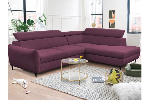 Rohová sedacia súprava v elegantnom dizajne prekvapí veľmi komfortným sedením. Pohodlne mäkké sedáky s polohovaním chrbtových opierok sa postarajú o Vašu každodennú pohodu. V prípade potreby môžete využiť praktický úložný priestor pod otomanom, ktorý vytvára pravý roh. Rozkladaciu funkciu pre príležitostné spanie ocení nielen Vaša návšteva. Rohová sedačka je očalúnená príjemne mäkkou látkou v odtieni fialová lila. Vďaka čiernym kovovým nôžkam pôsobí sedačka v interiéri moderne a zároveň vzdušne.