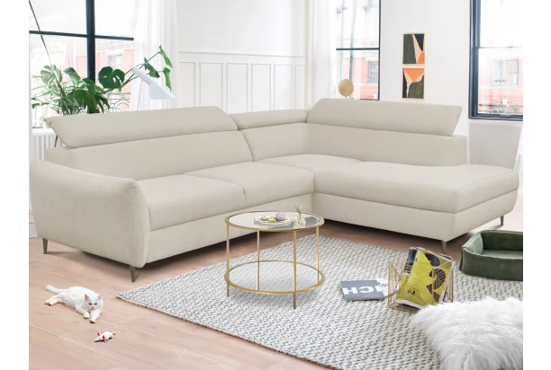 Rohová sedacia súprava v elegantnom dizajne prekvapí veľmi komfortným sedením. Pohodlne mäkké sedáky s polohovaním chrbtových opierok sa postarajú o vašu každodennú pohodu. V prípade potreby môžete využiť praktický úložný priestor pod otomanom, ktorý vytvára pravý roh. Rozkladaciu funkciu pre príležitostné spanie ocenia nielen vaša návšteva. Rohová sedačka je očalúnená príjemne mäkkou látkou v odtieni svetlo béžová. Vďaka čiernym kovovým nožičkám pôsobí sedačka v interiéri moderne a zároveň vzdušne.