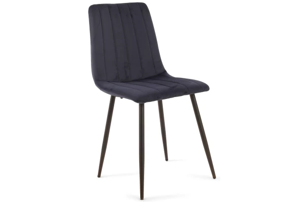 Jedálenská stolička na čiernych kovových nohách je očalúnená príjemne mäkkou zamatovou látkou vo farbe tmavo modrá. Látkový poťah stoličky dopĺňa trendové prešitie.