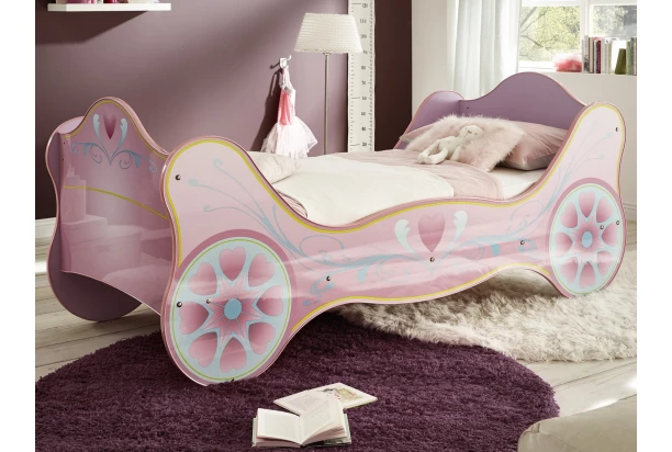 Detská posteľ s veľkosťou lôžka 90×200 cm v imitácii kráľovského kočiara poteší všetky malé princezničky. Vďaka tejto štýlovej posteli sa detská izbička ľahko premení na malé kráľovstvo snov a rozprávok. Zaoblená konštrukcia v tvare kočiara v odtieňoch ružovo-fialová lila poskytne útulné zázemie pre sladký spánok.