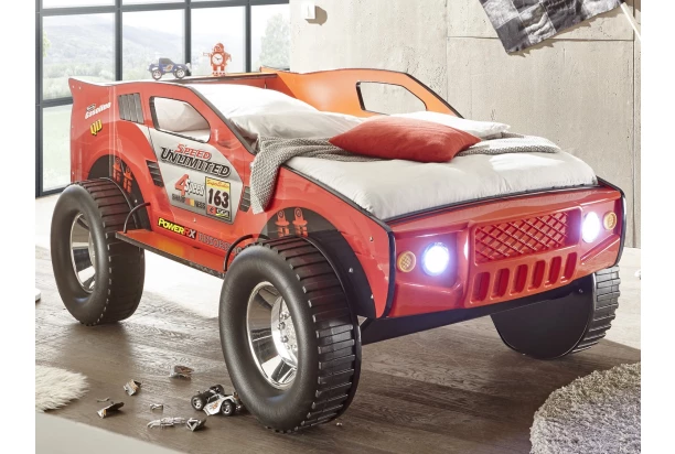 Parádna detská posteľ v tvare červeného závodného auta upúta pozornosť v každej detskej izbe. Tento terénny Jeep má krásne veľké kolesá, závodné polepy z bočných strán a prepracovanú prednú masku s LED svetlometmi, ktoré vytvoria štýlovú atmosféru v izbe počas večera. Lôžko s veľkosťou 90×200 cm je ľahko prístupné po bočnom nášľapnom schode rovnako ako pri pravom terénnom aute. Vymazlite si tak detskú izbu nielen plagátmi áut alebo trofejami, ale aj napríklad touto štýlovou posteľou, s ktorou môžete prežívať pravé dobrodružstvo priamo vo vašej detskej izbe.