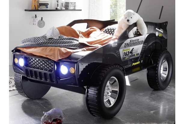 Parádna detská posteľ v tvare čierneho závodného auta upúta pozornosť v každej detskej izbe. Tento terénny Jeep má krásne veľké kolesá, závodné polepy z bočných strán a prepracovanú prednú masku s LED svetlometmi, ktoré vytvoria štýlovú atmosféru v izbe počas večera. Lôžko s veľkosťou 90×200 cm je ľahko prístupné po bočnom nášľapnom schode rovnako ako pri pravom terénnom aute. Vymazlite si tak detskú izbu nielen plagátmi áut alebo trofejami, ale aj napríklad touto štýlovou posteľou, s ktorou môžete prežívať pravé dobrodružstvo priamo vo vašej detskej izbe.