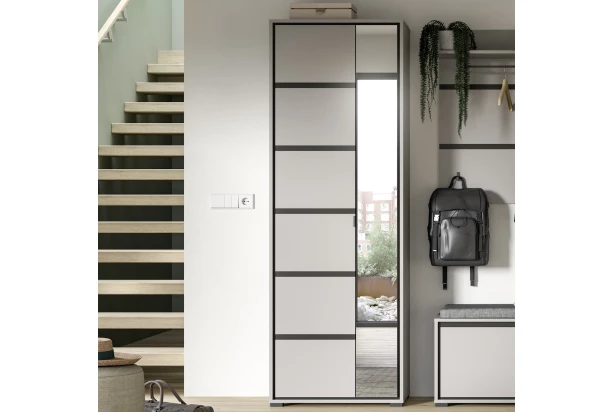 Predsieňová šatníková skriňa so zrkadlom z kolekcie Jaru – moderný nábytok v nadčasovej šedej farbe dokresľujú priamočiare čierne línie, vďaka ktorým pôsobia nezameniteľným dojmom. Štýlový minimalistický dizajn tohto nábytku navyše dotvára obľúbené bezúchytové prevedenie. Univerzálne šedé prevedenie sa hodí do akejkoľvek modernej predsiene a je možné kombinovať s mnohými modernými doplnkami, ku ktorým bude tento praktický nábytok skvele pasovať.