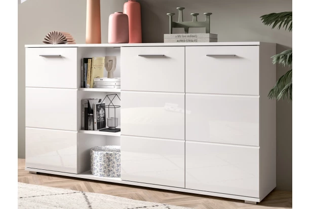 Široká skrinka s priehradkami z programu Prego – moderný, praktický a zároveň nadčasový nábytok s lesklo bielymi prednými plochami, ktoré sa hodia takmer do každého moderného interiéru. Predné plochy dopĺňajú elegantné horizontálne frézované línie. Skrinka so šírkou 150 cm má 3 otvorené odkladacie priehradky a 3 otočné dvere, za ktorými nájdete výškovo nastaviteľné police pre všestranné ukladanie najrôznejších vecí. Do otvorených priehradiek je možné umiestniť dekorácie, fotky, knižky, bielizeň alebo napríklad dokumenty. Skrinku tak využijete nielen v obývačke, jedálni alebo spálni, ale aj v priestore predsiene, chodby, šatne alebo domácej pracovne. Ľahko udržiavateľné povrchy je možné čistiť ľahko navlhčenou handričkou na odstránenie prachu a nečistôt. Táto biela úložná komoda bude vďaka svojmu univerzálnemu štýlu pasovať do mnohých domácností, kde prakticky poslúži.