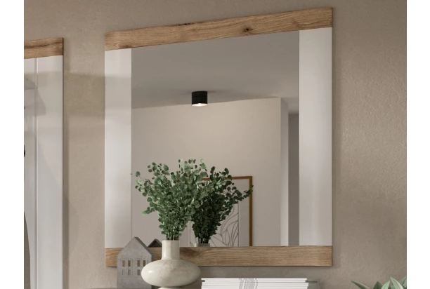 Nástenné zrkadlo v ráme z kolekcie Laredo – elegantný biely nábytok s dubovým drevodekorom má široké rámy so zaoblením. Tento štýlový nábytok pôsobí na pohľad masívnym dojmom a dobre doplní interiéry v klasickom alebo rustikálne ladenom štýle, kde vytvorí príjemnú domácku atmosféru.