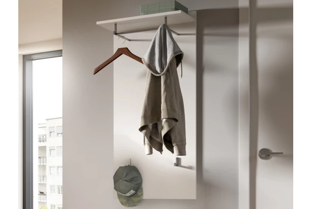 Nástenný šatníkový panel z programu Prego – moderný, praktický a zároveň nadčasový nábytok v bielom prevedení, ktorý sa hodí takmer do každého moderného interiéru. Šatníkový panel so šírkou 55 cm má hornú poličku na odkladanie rôznych doplnkov, šatníkovú tyč na zavesenie ošatenia a závesné háčiky, kam zavesíte tašku, kabelku, šiltovku alebo napríklad čiapku. Šatníkový panel môžete využiť nielen v priestore predsiene, ale napríklad aj na chodbe alebo v šatni. Ľahko udržiavateľné povrchy je možné čistiť ľahko navlhčenou handričkou na odstránenie prachu a nečistôt. Tento biely nástenný panel sa bude vďaka svojmu univerzálnemu štýlu hodiť do mnohých domácností, kde prakticky poslúži.