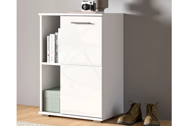 Skrinka s priehradkami/botník z programu Prego – moderný, praktický a zároveň nadčasový nábytok s lesklo bielymi prednými plochami, ktoré sa hodia takmer do každého moderného interiéru. Predné plochy dopĺňajú elegantné horizontálne frézované línie. Skrinka so šírkou 55 cm má 2 otvorené odkladacie priehradky a 1 otočné dvere, za ktorými nájdete výškovo nastaviteľné police pre všestranné ukladanie najrôznejších vecí. Skrinku tak využijete nielen v priestore predsiene ako botník, ale napríklad aj v šatni alebo na chodbe. Ľahko udržiavateľné povrchy je možné čistiť ľahko navlhčenou handričkou na odstránenie prachu a nečistôt. Táto biela skrinka bude vďaka svojmu univerzálnemu štýlu pasovať do mnohých domácností, kde prakticky poslúži.