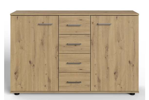 Komoda so zásuvkami v drevodekore dub artisan pôsobí útulne aj moderne. Za otočnými dverami nájdete police a do stredových zásuviek môžete ukladať doplnky alebo napríklad drobnú bielizeň.