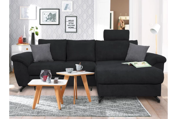 Rohová sedacia súprava na čiernych kovových nôžkach má elegantne zaoblené tvary a príjemný komfort sedenia. Sedačka je očalúnená látkou vo farbe čierna a doplnená malými vankúšikmi. Vďaka svojim rozmerom pasuje aj do menšieho priestoru, otoman môžete univerzálne umiestniť na pravú alebo ľavú stranu a prispôsobiť si tak roh sedačky podľa potreby. Oceníte aj rozkladaciu funkciu, úložný priestor alebo aj podhlavník, ktorý je možné umiestniť za ľubovoľný vankúš.