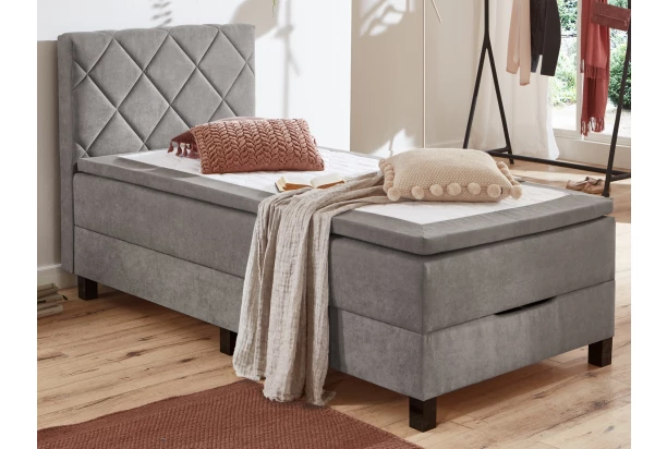Komfortná čalúnená posteľ o veľkosti lôžka 100×200 cm má komfortné vysoké lôžko doplnené príjemne mäkkým topperom. Posteľ je očalúnená látkou vo farbe šedá a chrbtové čelo doplnené atraktívnym prešivom. Pod lôžkom nájdete praktický úložný priestor na uschovanie lôžkovín alebo sezónnych vecí.