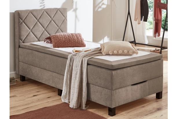 Komfortná čalúnená posteľ o veľkosti lôžka 100×200 cm má komfortné vysoké lôžko doplnené príjemne mäkkým topperom. Posteľ je očalúnená látkou vo farbe svetlohnedá a chrbtové čelo doplnené atraktívnym prešivom. Pod lôžkom nájdete praktický úložný priestor na uschovanie lôžkovín alebo sezónnych vecí.