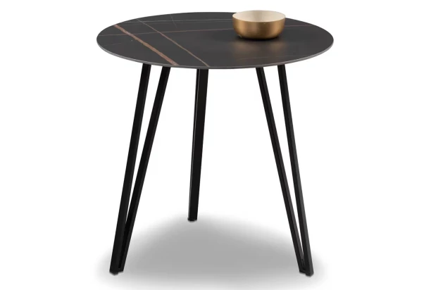Okrúhly stolík s priemerom 50 cm vyzerá luxusne vďaka imitácii tmavého mramoru. Moderný design stolíka dotvárajú stabilné nohy z čierneho kovu. Tento stolík môže byť využitý ako malý konferenčný stolík alebo ako prístavný odkladací stolík vedľa sedačky.
