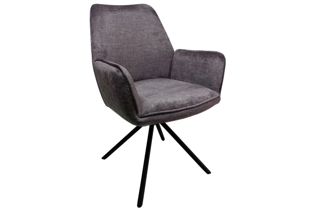 Luxusná jedálenská stolička v komfortnom tvare kresielka je očalúnená zamatovo hebkou látkou vo farbe grafitová tmavo šedá. Pohodlné sedenie dopĺňa otočný sedák a čierna kovová podnož v modernom tvare.