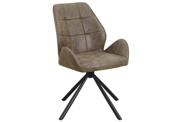 Komfortne tvarovaná jedálenská stolička je očalúnená príjemne hebkou látkou vo farbe olivovo zelená. Moderná čierna kovová podnož zaisťuje stabilitu, sedák stoličky je navyše otočný o 360 °.