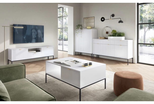 Konferenčný stolík so zásuvkami z kolekcie Nova – atraktívny nábytok s bielymi štruktúrovanými povrchmi ,zaujme v každom moderne zariadenom interiéri. Štýlový dizajn podčiarkujú úchytky v zlatom prevedení a čierna kovová podnož, vďaka ktorej pôsobí nábytok ľahko a zároveň umožňuje ľahšiu údržbu podlahy.