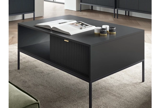 Konferenčný stolík so zásuvkami z kolekcie Nova – atraktívny nábytok s čiernymi štruktúrovanými povrchmi zaujme v každom moderne zariadenom interiéri. Štýlový dizajn podčiarkujú úchytky v zlatom prevedení a čierna kovová podnož, vďaka ktorej pôsobí nábytok ľahko a zároveň umožňuje ľahšiu údržbu podlahy.