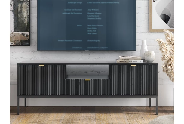 TV skrinka z kolekcie Nova – atraktívny nábytok s čiernymi štruktúrovanými povrchmi zaujme v každom moderne zariadenom interiéri. Štýlový dizajn podčiarkujú úchytky v zlatom prevedení a čierna kovová podnož, vďaka ktorej pôsobí nábytok ľahko a zároveň umožňuje ľahšiu údržbu podlahy.
