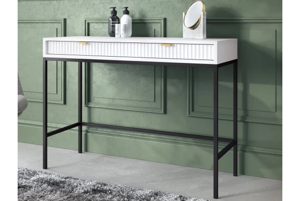 Univerzálny stolík z kolekcie Nova – atraktívny nábytok s bielymi štruktúrovanými povrchmi zaujme v každom moderne zariadenom interiéri. Štýlový dizajn podčiarkujú úchytky v zlatom prevedení a čierna kovová podnož, vďaka ktorej pôsobí nábytok ľahko a zároveň umožňuje ľahšiu údržbu podlahy. Stolík môže byť využitý ako stôl písací, toaletný alebo len tak na odkladanie.