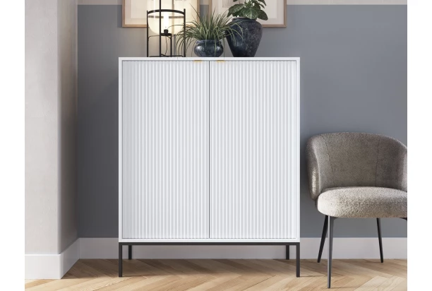 Vysoká skrinka z kolekcie Nova – atraktívny nábytok s bielymi štruktúrovanými povrchmi, zaujme v každom moderne zariadenom interiéri. Štýlový dizajn podčiarkujú úchytky v zlatom prevedení a čierna kovová podnož, vďaka ktorej pôsobí nábytok ľahko a zároveň umožňuje ľahšiu údržbu podlahy.