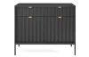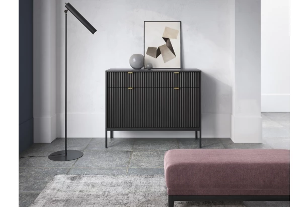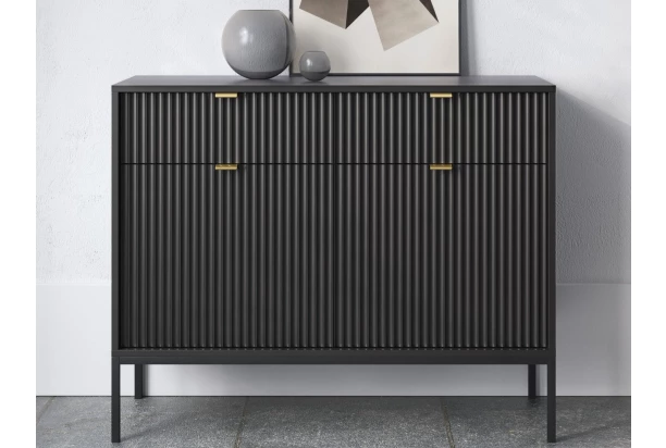 Komoda so zásuvkami z kolekcie Nova – atraktívny nábytok s čiernymi štruktúrovanými povrchmi, zaujme v každom moderne zariadenom interiéri. Štýlový dizajn podčiarkujú úchytky v zlatom prevedení a čierna kovová podnož, vďaka ktorej pôsobí nábytok ľahko a zároveň umožňuje ľahšiu údržbu podlahy.