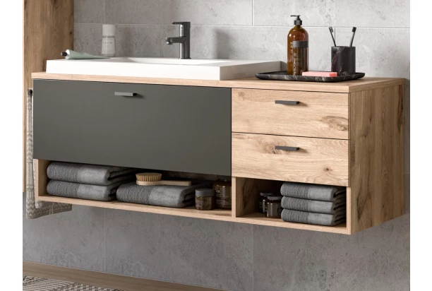Závesná kúpeľňová skrinka s umývadlom z programu Grado – objavte skvelú kombináciu moderného štýlu a praktického využitia pre váš domov. Nábytok v drevodekore dub nox so šedými plochami pôsobí v priestore kúpeľne útulne. Táto praktická nástenná skrinka so šírkou 138 cm ponúka pod umývadlom dostatok úložného priestoru na uloženie kúpeľňových potrieb a uterákov, do zásuviek a otvorených priehradok môžete uložiť napríklad kozmetiku alebo hygienické potreby. Skrinka je vyrobená z kvalitných materiálov a má stabilnú a odolnú konštrukciu. Ľahko udržiavateľné povrchy umožňujú ľahké čistenie a údržbu, čo zaručuje dlhú životnosť. Vďaka zaveseniu na stenu môžete ľahko udržovať podlahu v priestore kúpeľne.
