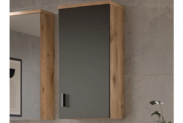Závesná kúpeľňová skrinka z programu Grado – objavte skvelú kombináciu moderného štýlu a praktického využitia pre váš domov. Nábytok v drevodekore dub nox so šedými plochami pôsobí v priestore kúpeľne útulne. Táto nástenná skrinka so šírkou 37 cm má 1 dvere, za ktorými nájdete úložný priestor s výškovo nastaviteľnou poličkou, kam uložíte napríklad kozmetiku alebo hygienické potreby. Skrinka je vyrobená z kvalitných materiálov a má stabilnú a odolnú konštrukciu. Ľahko udržiavateľné povrchy umožňujú ľahké čistenie a údržbu, čo zaručuje dlhú životnosť.