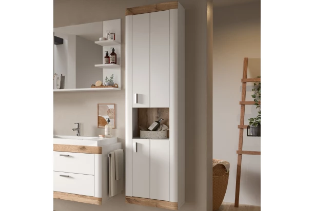 Vysoká nástenná kúpeľňová skrinka z kolekcie Laredo – elegantný biely nábytok v kombinácii s dubovým drevodekorom má okrasne rylované línie a široké predné rámy so zaoblením. Tento štýlový nábytok pôsobí na pohľad masívnym dojmom a dobre doplní interiéry v klasickom alebo rustikálne ladenom štýle, kde vytvorí príjemnú domácku atmosféru.