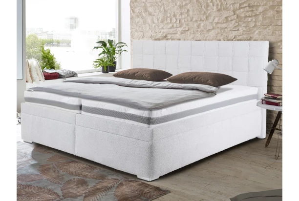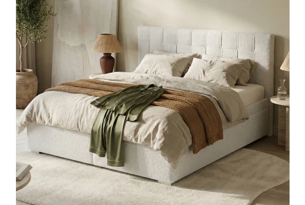 Dvojlôžková posteľ o veľkosti 180×200 cm zaujme zaujímavým dizajnom čela s prepletenou látkou a prešivom. Posteľ je očalúnená mäkučkou látkou s dlhším štruktúrovaným vlasom vo farbe svetlo šedá. Stabilný rám lôžka je vybavený lamelovými roštmi s funkciou polohovania. Pod výklopnými roštmi nájdete úložné priestory, kam uschováte lôžkoviny alebo napríklad veci sezónnej potreby.