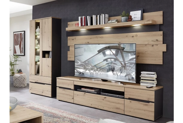Obývacia stena z kolekcie Memphis – nábytok v modernom a zároveň funkčnom dizajne zaujme zaujímavou profiláciou predných plôch. Nábytok je vyrobený v kontrastnej kombinácii matný grafit s útulným drevodekorom dub artisan. Tento moderný nábytok vytvorí elegantnú atmosféru v interiéri a zároveň prakticky poslúži v každej domácnosti. Nechýba ani osvetlenie na doplnenie príjemnej večernej atmosféry.