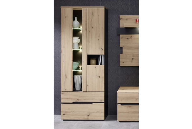 Vysoká vitrína s osvetlením z programu Memphis – nábytok v modernom a zároveň funkčnom designe zaujme zaujímavou profiláciou predných plôch. Nábytok je vyrobený v kontrastnej kombinácii matný grafit s útulným drevodekorom dub artisan. Tento moderný nábytok vytvorí elegantnú atmosféru v interiéri a zároveň prakticky poslúži v každej domácnosti. Vysoká komoda so šírkou 75 cm a výškou 197 cm má 2 zásuvky v spodnej časti a 3 otočné dvierka. Jedno z nich disponuje čírym sklom, ideálne na prezentáciu dekorácií. LED osvetlenie políc efektívne zvýrazňuje a rozjasňuje všetky vystavené doplnky.
