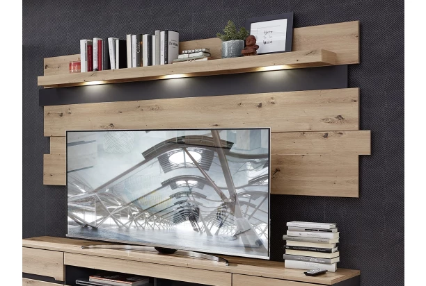 Nástenný panel s osvetlením z programu Memphis – moderný nábytok v kontrastnej kombinácii matný grafit s útulným drevodekorom dub artisan. Tento panel na stenu o šírke 202 cm vytvorí elegantnú atmosféru v interiéri a zároveň prakticky poslúži v každej domácnosti. Nástenný panel je ideálny na umiestnenie vašich dekorácií.