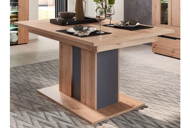 Rozkladací jedálenský stôl z programu Memphis – moderný nábytok v kontrastnej kombinácii matný grafit s útulným drevodekorom dub artisan. Tento obdĺžnikový stôl ponúka vďaka svojej jedálenskej ploche 160×90 cm dostatok priestoru na trávenie času s blízkymi. Praktická predlžovacia doska umožňuje roztiahnuť stôl na dĺžku 210 cm.