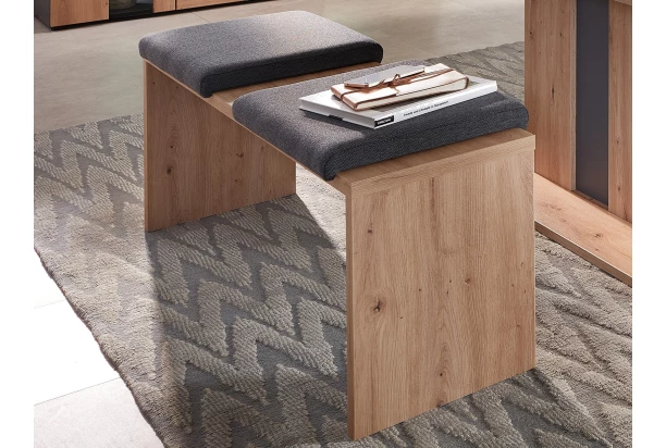 Jedálenská lavica s 2 polstrami z programu Memphis – moderný nábytok je vyrobený v kontrastnej kombinácii matný grafit s útulným drevodekorom dub artisan. Štýlová a praktická lavica so šírkou 130 cm je vybavená sedacím vankúšom pre pohodlné sedenie.