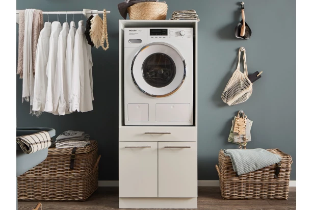 Úložná skrinka pod práčku z kolekcie Mr. Sauber predstavuje moderné, praktické a univerzálne riešenie úložného priestoru pre vašu kúpeľňu, domácu práčovňu alebo miestnosť na upratovanie. Univerzálne biele prevedenie ľahko pasuje do akejkoľvek miestnosti. Skriňa pomôže udržať poriadok nielen v kúpeľni, ale aj v práčovni, šatni či inej miestnosti určenej na upratovanie. Čisté línie, moderný vzhľad a jednoduchá kombinovateľnosť s ostatnými prvkami z programu z nej robia funkčný a estetický doplnok každej domácnosti. Ideálne na usporiadanie všetkých vašich nevyhnutností so štýlovou jednoduchosťou. Skrinka obsahuje výsuvnú policu na odkladanie práčovného koša a 2 otočné dvere, za ktorými nájdete otvorený úložný priestor. Do otvorenej hornej časti môžete umiestniť práčku, sušičku alebo napríklad kôš na bielizeň.