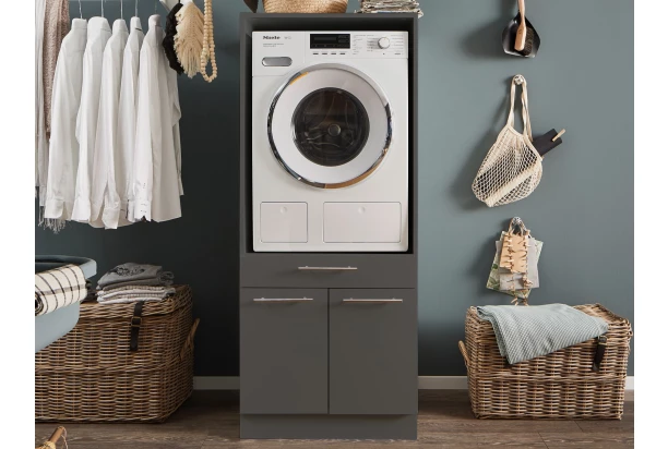 Úložná skrinka pod práčku z kolekcie Mr. Sauber predstavuje moderné, praktické a univerzálne riešenie úložného priestoru pre vašu kúpeľňu, domácu práčovňu alebo miestnosť na upratovanie. Univerzálne antracitové prevedenie ľahko pasuje do akejkoľvek miestnosti. Skriňa pomôže udržať poriadok nielen v kúpeľni, ale aj v práčovni, šatni či inej miestnosti určenej na upratovanie. Čisté línie, moderný vzhľad a jednoduchá kombinovateľnosť s ostatnými prvkami z programu z nej robia funkčný a estetický doplnok každej domácnosti. Ideálne na usporiadanie všetkých vašich nevyhnutností so štýlovou jednoduchosťou. Skrinka obsahuje zásuvku a 2 otočné dvere, za ktorými nájdete otvorený úložný priestor. Do otvorenej hornej časti môžete umiestniť práčku, sušičku alebo napríklad kôš na bielizeň.