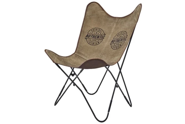 Štýlové kresielko na kovovej konštrukcii má sedák z pevnej tkaniny, ktorá sa tvarovo prispôsobí. Hnedo-béžová tkanina vo vintage optike je doplnená hnedými koženými lemami a čiernou potlačou. Táto zaujímavá stolička je skvelým doplnkom do štýlového interiéru.