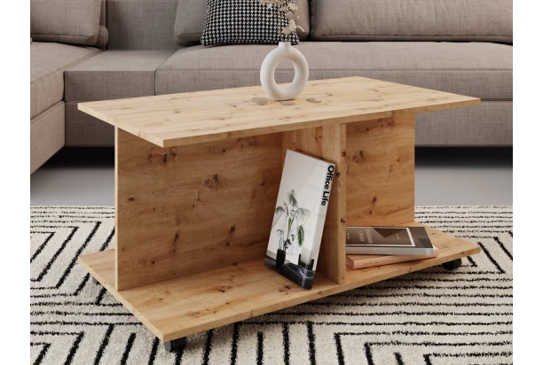 Klasický konferenčný stolík v obdĺžnikovom tvare s veľkosťou 90×40 cm je vyrobený v dekore dub artisan a vďaka konštrukcii na kolieskach je možné ľahko presunúť. Do dolných priehradiek stolíka ľahko odložíte knižky alebo časopisy.