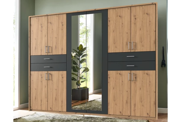 Šatníková skriňa o celkovej šírke 270 cm je vyrobená v kombinácii dub artisan/tmavo šedý grafit. Táto dobre riešená skriňa s 2 zrkadlami ponúka prakticky členené úložné priestory za 10 otočnými dverami, kde nájdete navyše vnútorné police aj závesné šatníkové tyče. Drobnú bielizeň môžete ľahko ukladať do 4 širokých zásuviek, ktoré sú uložené v komfortnej výške. Túto priestrannú skriňu využijete nielen v spálni, ale aj v priestore chodby alebo veľkej šatne.