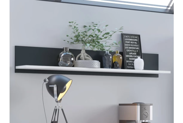 Nástenná polica so šírkou 160 cm z programu Campania – moderný minimalistický štýl s rovnými antracitovými líniami kontrastuje s čisto bielymi plochami. Môžete si tak zariadiť moderný interiér, ktorý budete môcť kedykoľvek univerzálne kombinovať s ďalšími farbami, čo je veľmi praktické.