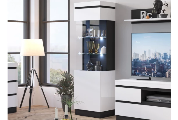 Vysoká vitrína s presklením o šírke 60 cm z programu Campania – moderný minimalistický štýl s rovnými antracitovými líniami kontrastuje s čisto bielymi plochami. Môžete si tak zariadiť moderný interiér, ktorý budete môcť kedykoľvek univerzálne kombinovať s ďalšími farbami, čo je veľmi praktické. Pravý variant vitríny – dvere sa otvárajú na pravú stranu.