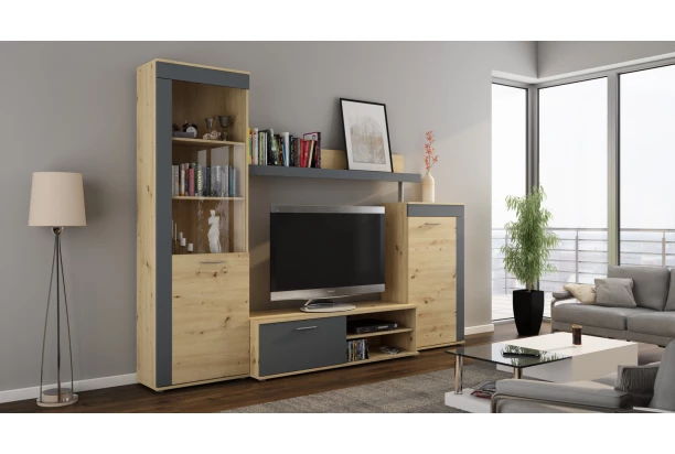 Obývacia stena v útulnej kombinácii dub artisan/grafit. Predné lišty podčiarkujú kompaktný dizajn celej zostavy nábytku.