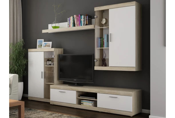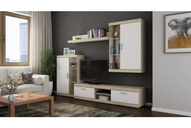 Obývacia stena v obľúbenom trendy štýle obsahuje štyri diely, ktoré môžu tvoriť spoločný celok alebo ich môžete rozmiestniť samostatne. Vyrobená v príjemnej kombinácii dekoru dub sonoma/biela.